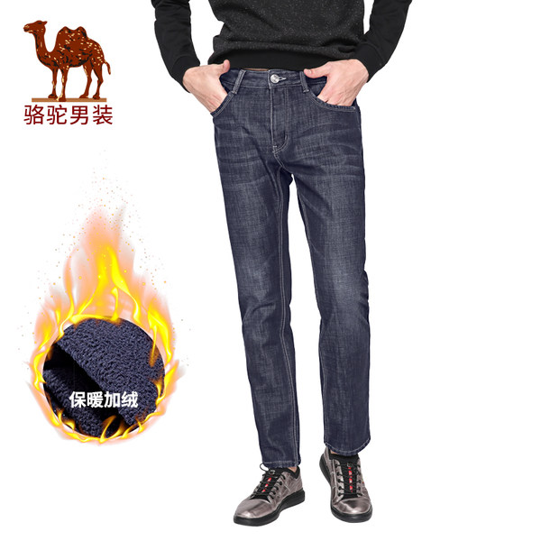 骆驼男装 冬季新款加绒加厚水洗猫须直筒男青年牛仔裤长裤