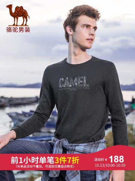 骆驼男装 2018秋冬新款青年时尚圆领长袖上衣服纯色字母绣花T恤男