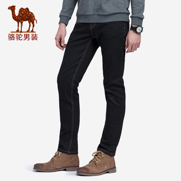 骆驼男装2018秋季新款男士青年黑色水洗长裤中腰直筒休闲牛仔裤男