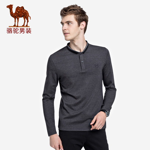骆驼男装 2018秋季新款翻领男士长袖T恤时尚纯色花纱休闲Polo上衣